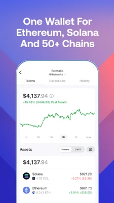 No more switching between wallets! Zerion is your all-in-one Solana wallet, Ethereum wallet, BNB Chain wallet, and Base wallet. Supporting 50+ blockchains, all your assets are always at your fingertips.